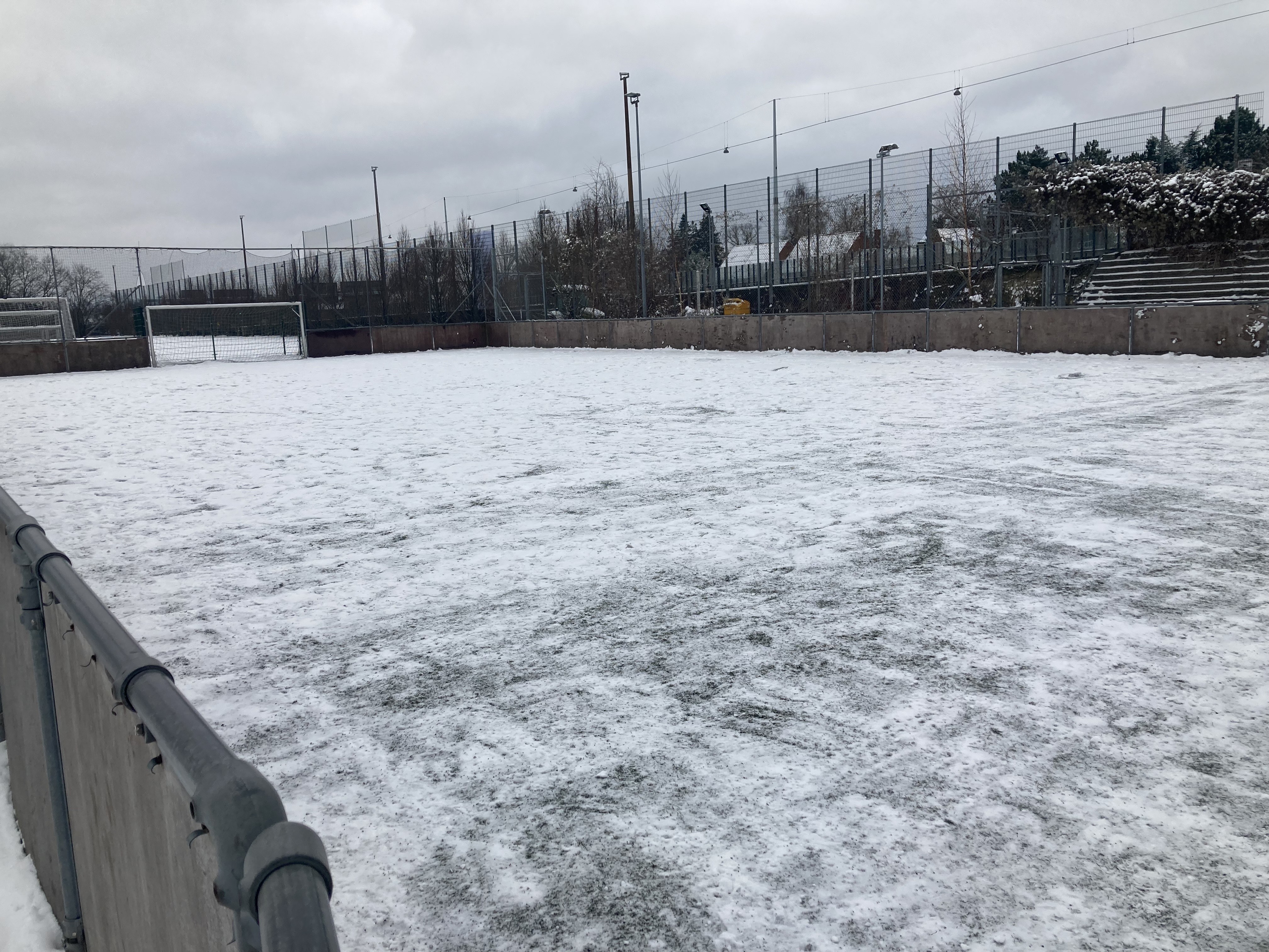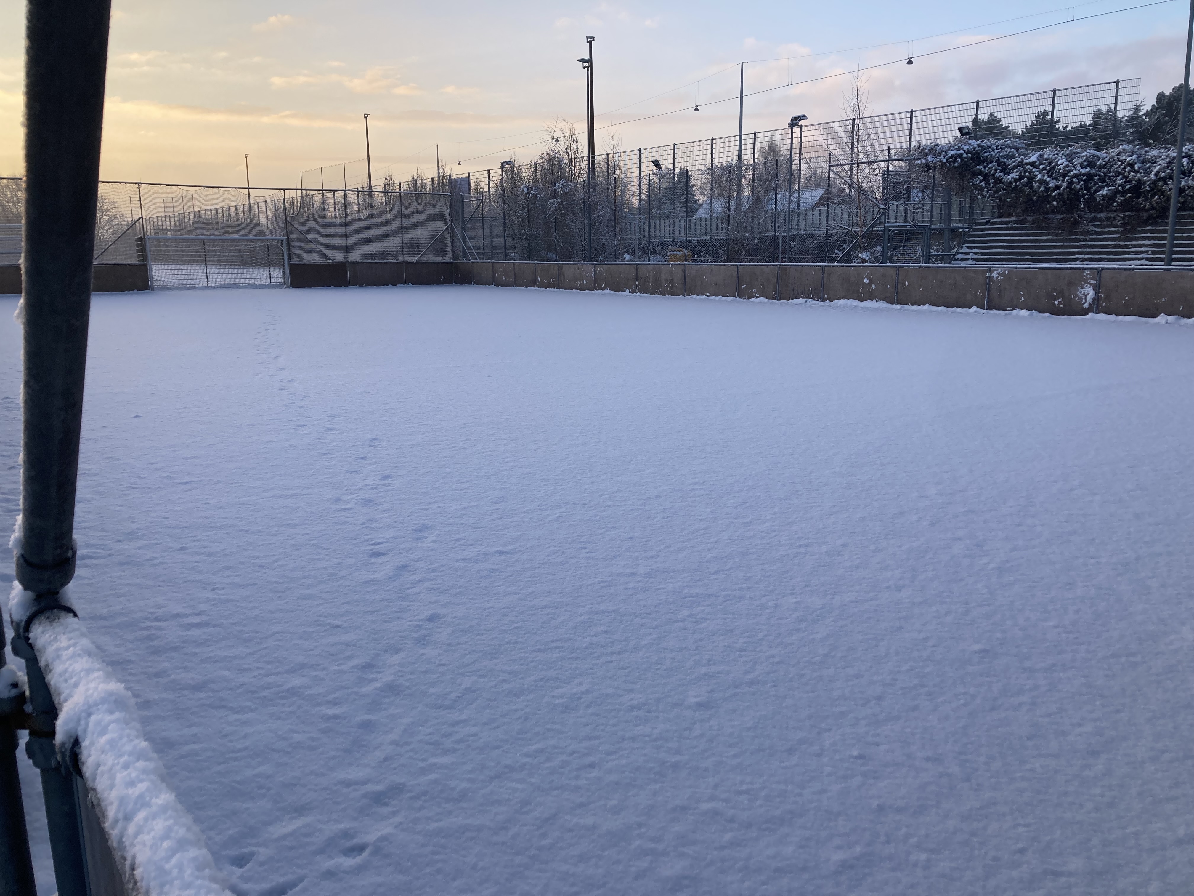De hold som skal træne på bandebanen nede i B1903, der ligger et par cm sne og anbefalingen er, at træningen i dag ikke gennemføres.
