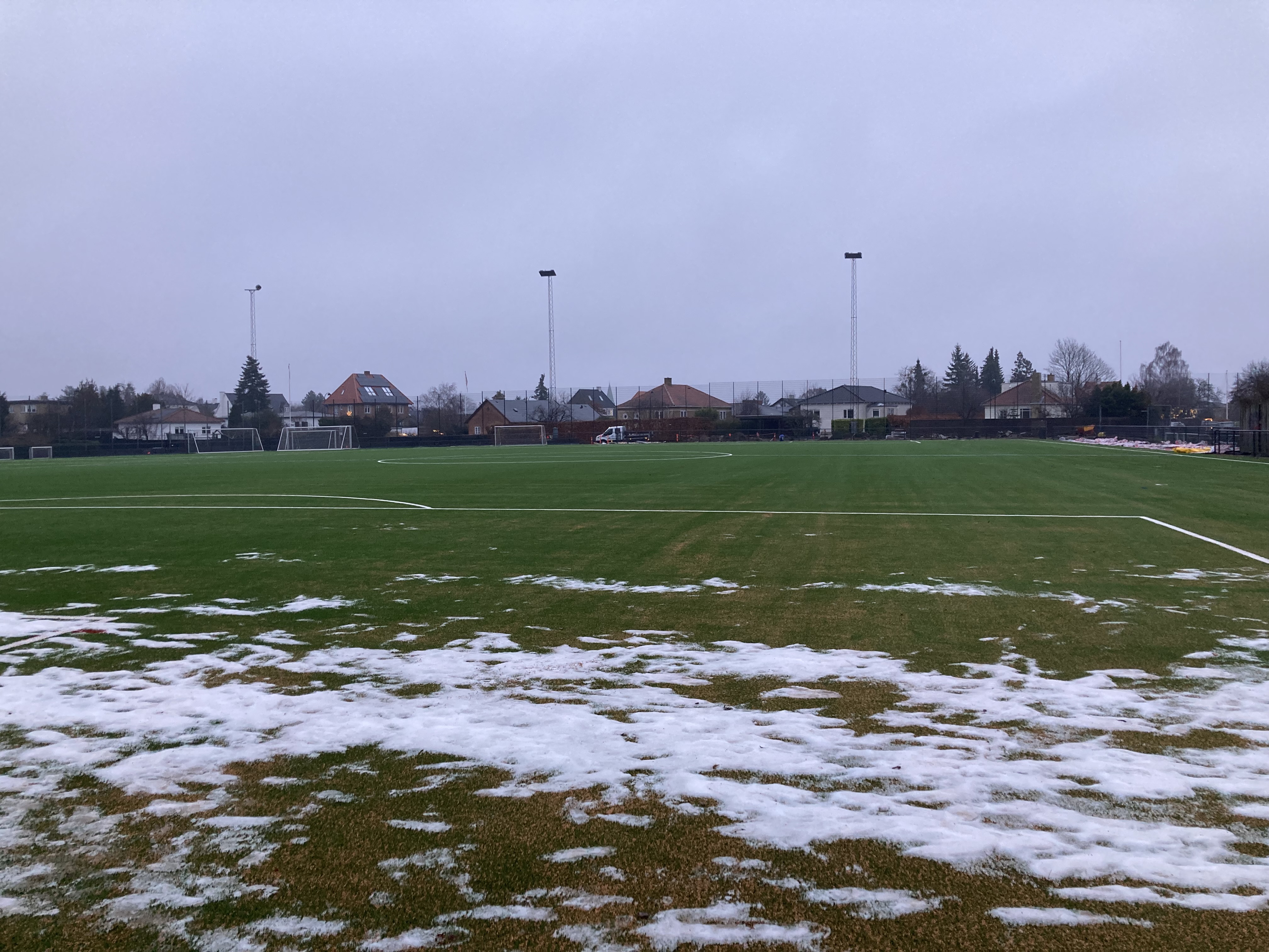 Bandebanen i B1903 har et tyndt lag sne, og enkelte steder lidt sneklumper, se billede. Med vejrudsigten i dag forventes det, at det lag bliver endnu mindre, og at der godt kan trænes. Dog skal træningen nok indrettes lidt efter forholdene. Det er ikke til decideret teknisk træning, men savner med højt humør og få rørt sig, så kan man godt lave lidt kamp på banen.