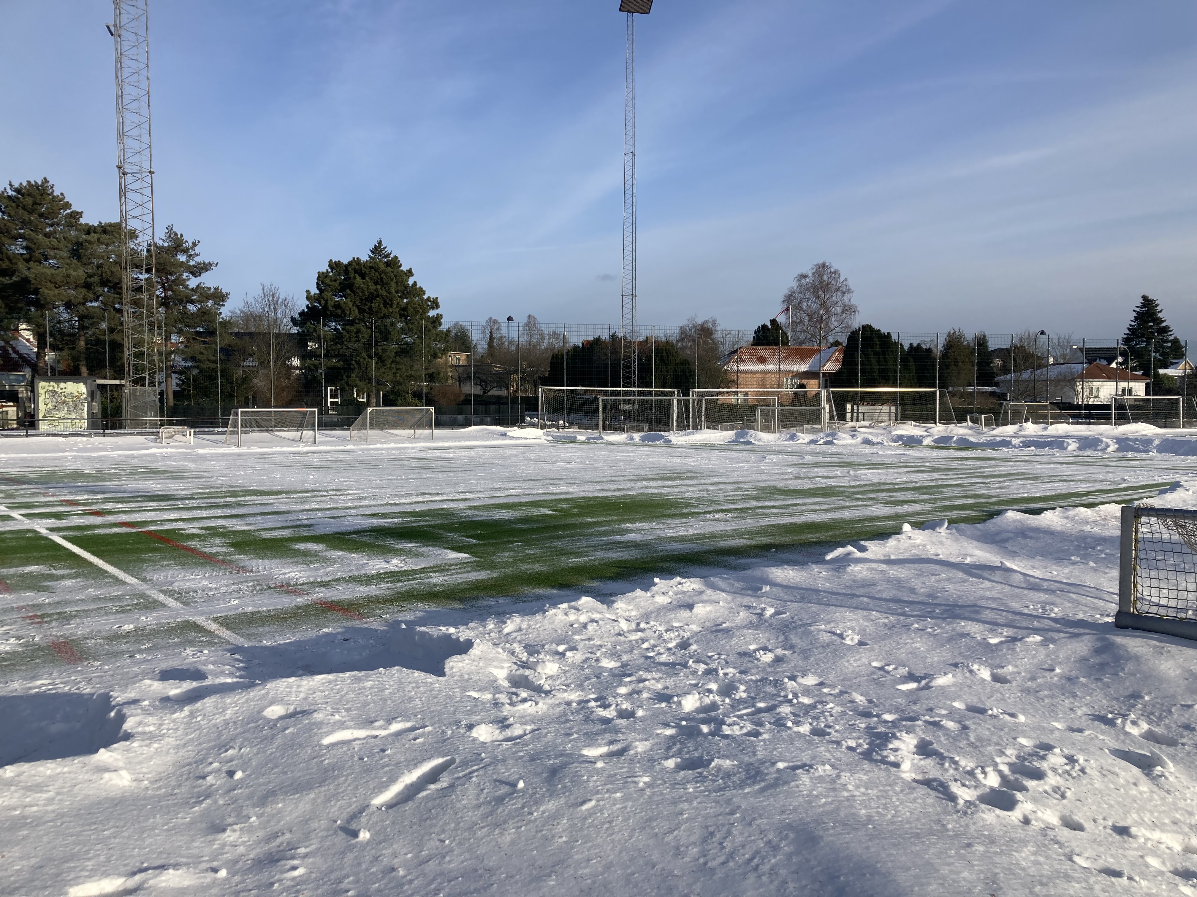Snerydderne har været her henover frokost og fjerne snebunkerne i feltet og langs sidelinjen. Super godt, så nu kan der trænes på hele banen.